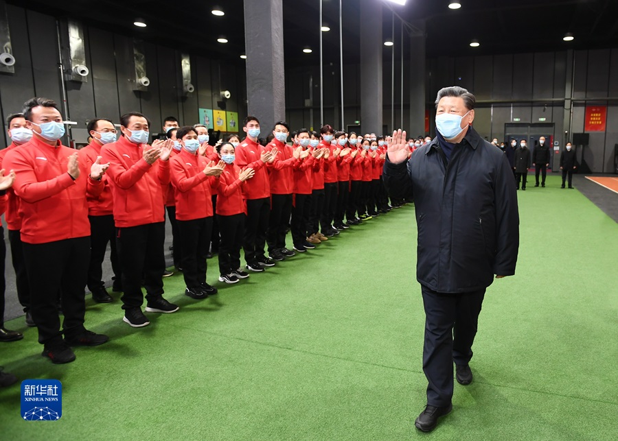 1月4日,中共中央總書(shū)記、國(guó)家主席、中央軍委主席習(xí)近平在北京考察2022年冬奧會(huì)、冬殘奧會(huì)籌辦備賽工作。這是4日下午,習(xí)近平在二七廠冰雪項(xiàng)目訓(xùn)練基地專(zhuān)項(xiàng)體能訓(xùn)練館,向運(yùn)動(dòng)員、教練員、服務(wù)保障人員揮手致意。新華社記者 謝環(huán)馳 攝
