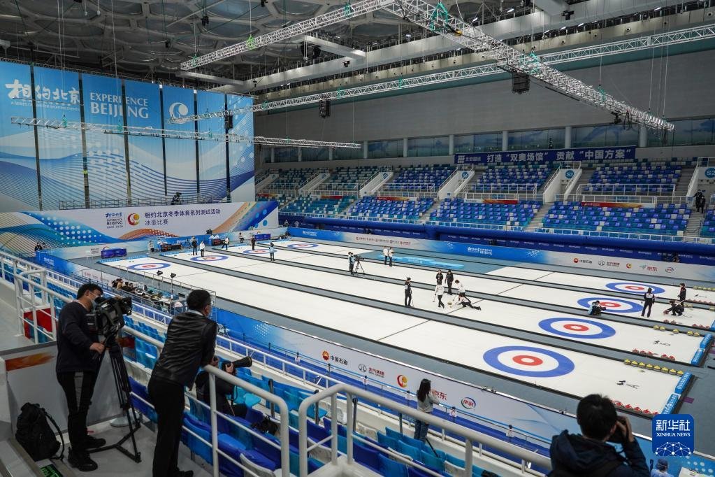 2021年4月6日,運動員在冰壺項目測試活動中。2022年北京冬奧會將國家游泳中心“水立方”改造為“冰立方”,用作冰壺項目比賽場館,有效減少建設(shè)投資,更讓夏奧場館煥然新生,拓展多元賽后經(jīng)營能力。新華社記者彭子洋攝