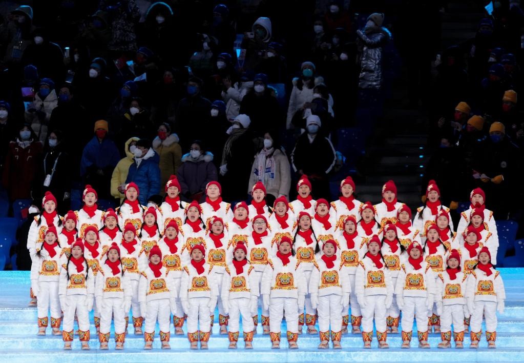 2月4日晚,第二十四屆冬季奧林匹克運(yùn)動會開幕式在北京國家體育場舉行。圖為孩子們演唱奧林匹克會歌。新華社記者李安攝