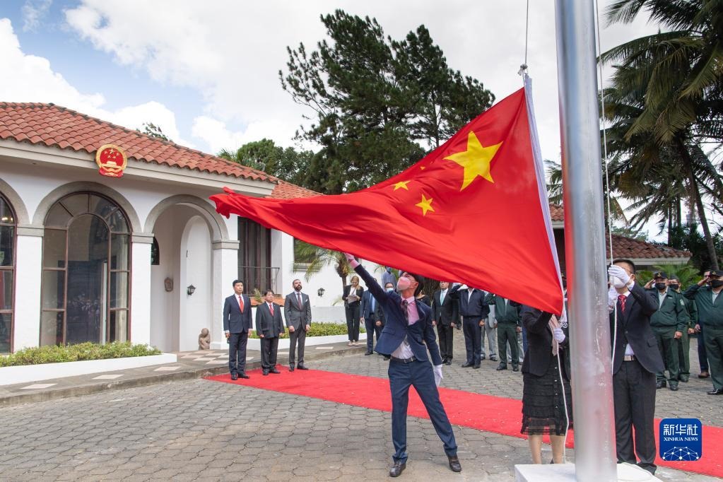 在尼加拉瓜首都馬那瓜舉行的中國駐尼加拉瓜大使館復(fù)館儀式上,五星紅旗伴隨著《義勇軍進行曲》冉冉升起(2021年12月31日攝)。新華社記者 辛悅衛(wèi) 攝