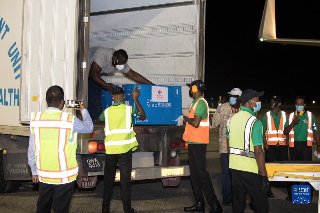 工作人員在圭亞那首都喬治敦國際機場搬運中國援助的新冠疫苗(2021年3月2日攝)。新華社發(fā)(圭亞那新聞署供圖)