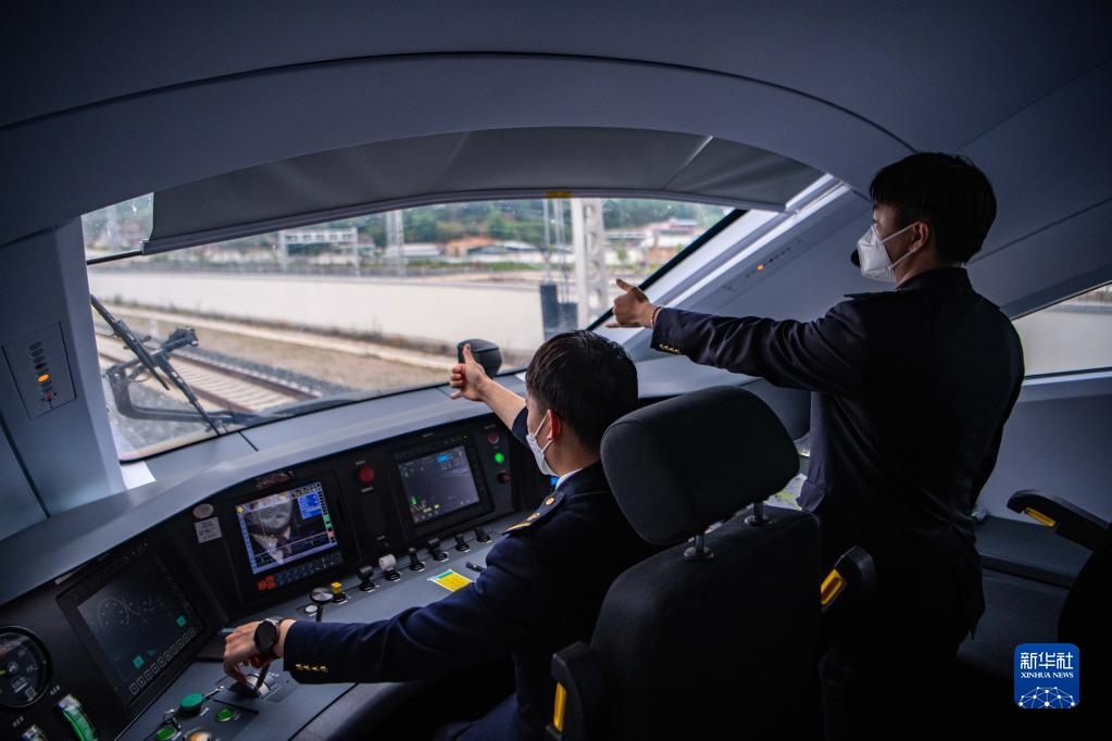 列車司機駕駛復(fù)興號列車行駛在中老鐵路上(2022年6月1日攝)。新華社記者 江文耀 攝