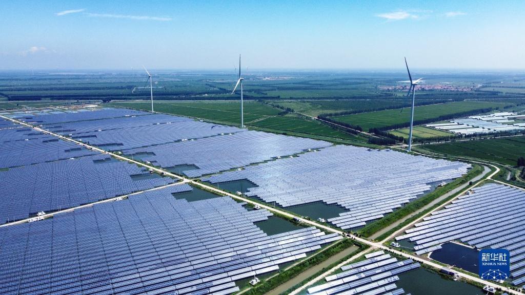 這是在天津市寧河區(qū)寧河鎮(zhèn)大月河村拍攝的110千伏大月河光伏電站(2022年7月18日攝,無人機照片)。新華社記者 孫凡越 攝