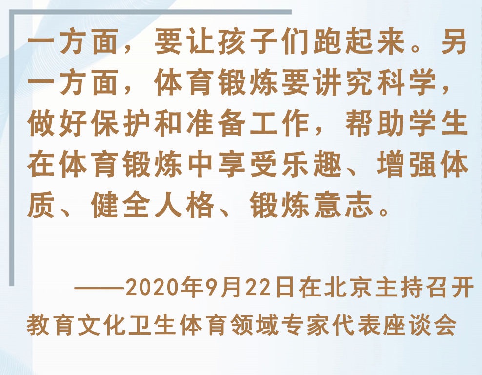 青少年是祖國的未來、民族的希望。強(qiáng)健的體魄是青少年成長成才的重要前提。對(duì)加強(qiáng)體育教育,增強(qiáng)青少年體質(zhì),習(xí)近平總書記念茲在茲。