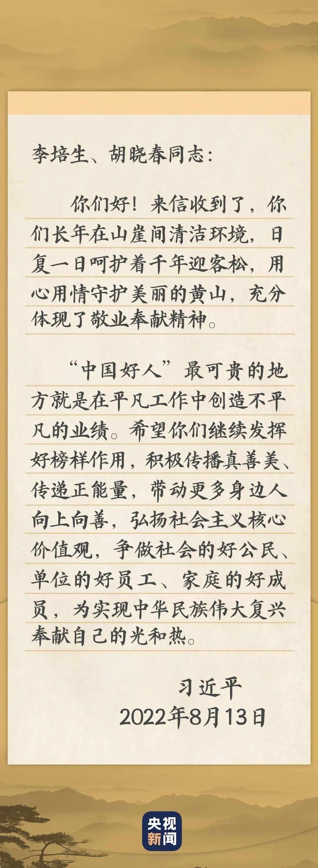 黃山之巔,迎客松畔。雙手接過(guò)總書記的回信,“中國(guó)好人”李培生和胡曉春熱淚盈眶。