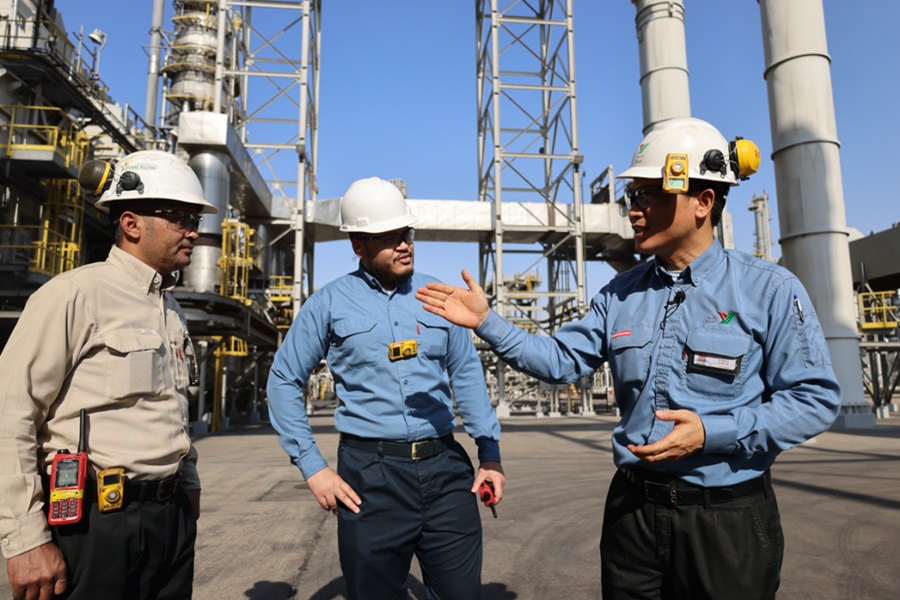 2022年11月27日,在沙特西部城市延布,中沙延布煉廠的員工在交流。總投資86億美元的中沙延布煉廠是中國(guó)石化與沙特阿拉伯石油公司合資興建的項(xiàng)目,自2016年1月20日由兩國(guó)元首共同啟動(dòng)投產(chǎn)以來(lái),發(fā)展迅速。今年1月至8月累計(jì)實(shí)現(xiàn)利潤(rùn)11.5億美元。