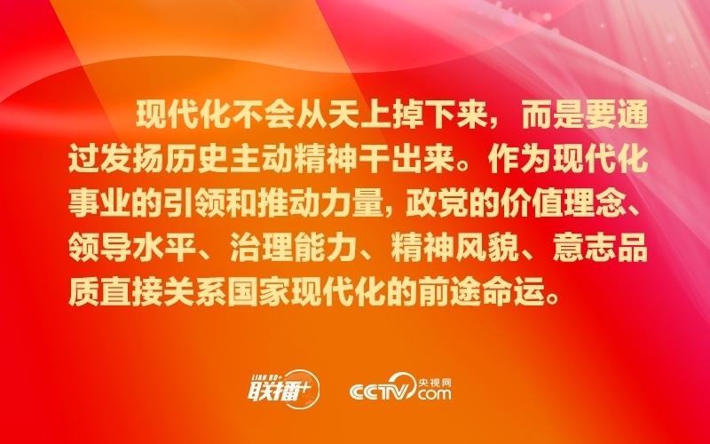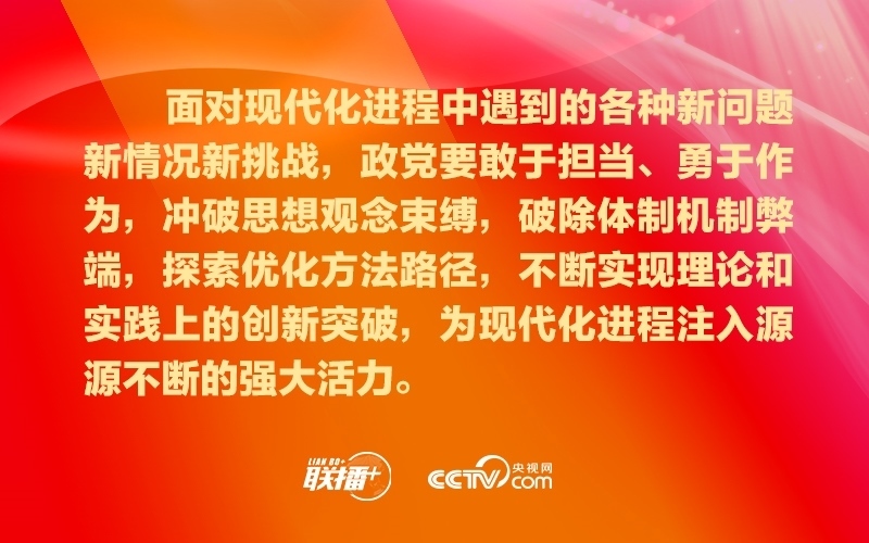 政黨要把自身建設和國家現(xiàn)代化建設緊密結合起來,踔厲奮發(fā),勇毅篤行,超越自我,確保始終有信心、有意志、有能力應對好時代挑戰(zhàn)、回答好時代命題、呼應好人民期盼,為不斷推進現(xiàn)代化進程引領方向、凝聚力量。