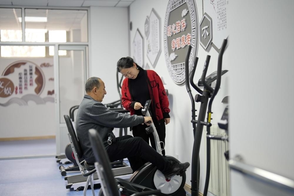 2023年4月16日,老年人在唐山市豐南區(qū)胥各莊鎮(zhèn)一處社區(qū)養(yǎng)老服務中心內健身。新華社記者 牟宇 攝