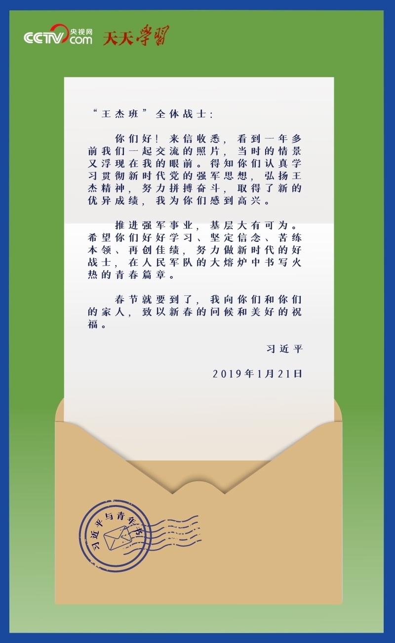 “你們好!來信收悉,看到一年多前我們一起交流的照片,當(dāng)時的情景又浮現(xiàn)在我的眼前。得知你們認(rèn)真學(xué)習(xí)貫徹新時代黨的強(qiáng)軍思想,弘揚(yáng)王杰精神,努力拼搏奮斗,取得了新的優(yōu)異成績,我為你們感到高興……”
