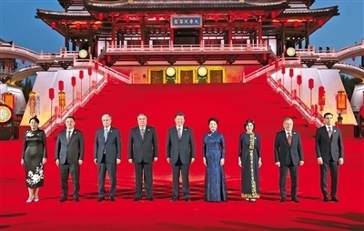 5月18日晚,國家主席習(xí)近平和夫人彭麗媛在陜西省西安市大唐芙蓉園為出席中國—中亞峰會的中亞國家元首夫婦舉行歡迎儀式和歡迎宴會。宴會后,習(xí)近平夫婦同貴賓們共同觀看中國同中亞國家人民文化藝術(shù)年暨中國—中亞青年藝術(shù)節(jié)開幕式演出。這是習(xí)近平夫婦在紫云樓前同貴賓合影留念。 新華社記者 丁海濤攝