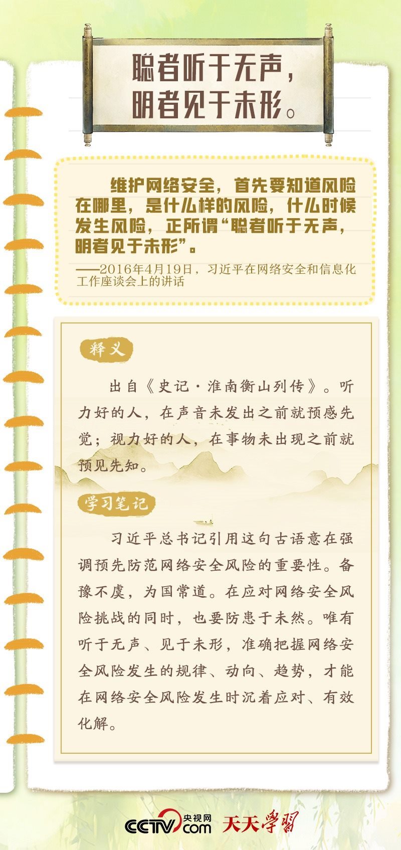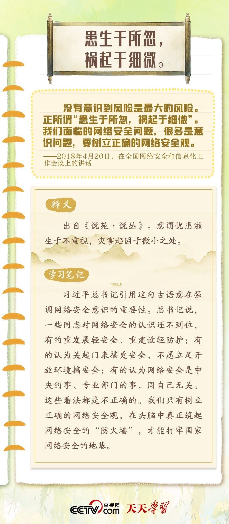 習近平總書記重視網(wǎng)絡安全工作,曾多次在講話中以典明理,深刻闡釋網(wǎng)絡安全工作的重要意義?!熬W(wǎng)絡安全宣傳周”到來之際,央視網(wǎng)《天天學習》特梳理總書記關于網(wǎng)絡安全的用典,與您一起學習領悟。
