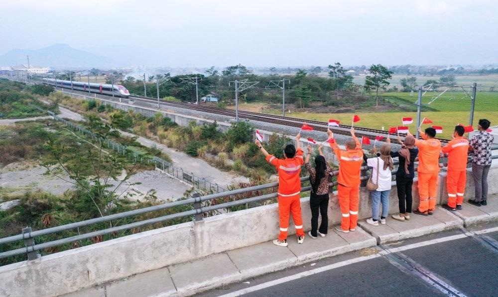 △2023年10月17日,在印度尼西亞萬(wàn)隆一座天橋上,雅萬(wàn)高鐵中國(guó)建設(shè)者和印尼籍員工揮舞著中國(guó)和印尼兩國(guó)國(guó)旗,向遠(yuǎn)處駛來(lái)的一列雅萬(wàn)高鐵高速動(dòng)車組列車歡呼。