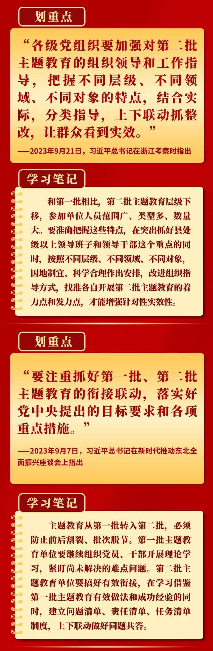 當(dāng)前,第二批學(xué)習(xí)貫徹習(xí)近平新時(shí)代中國(guó)特色社會(huì)主義思想主題教育扎實(shí)推進(jìn)。9月以來(lái),習(xí)近平總書記在黑龍江、浙江、江西考察時(shí),對(duì)第二批主題教育工作提出明確要求,為持續(xù)開展好這件“事關(guān)全局的大事”指明方向。一起學(xué)習(xí)。
