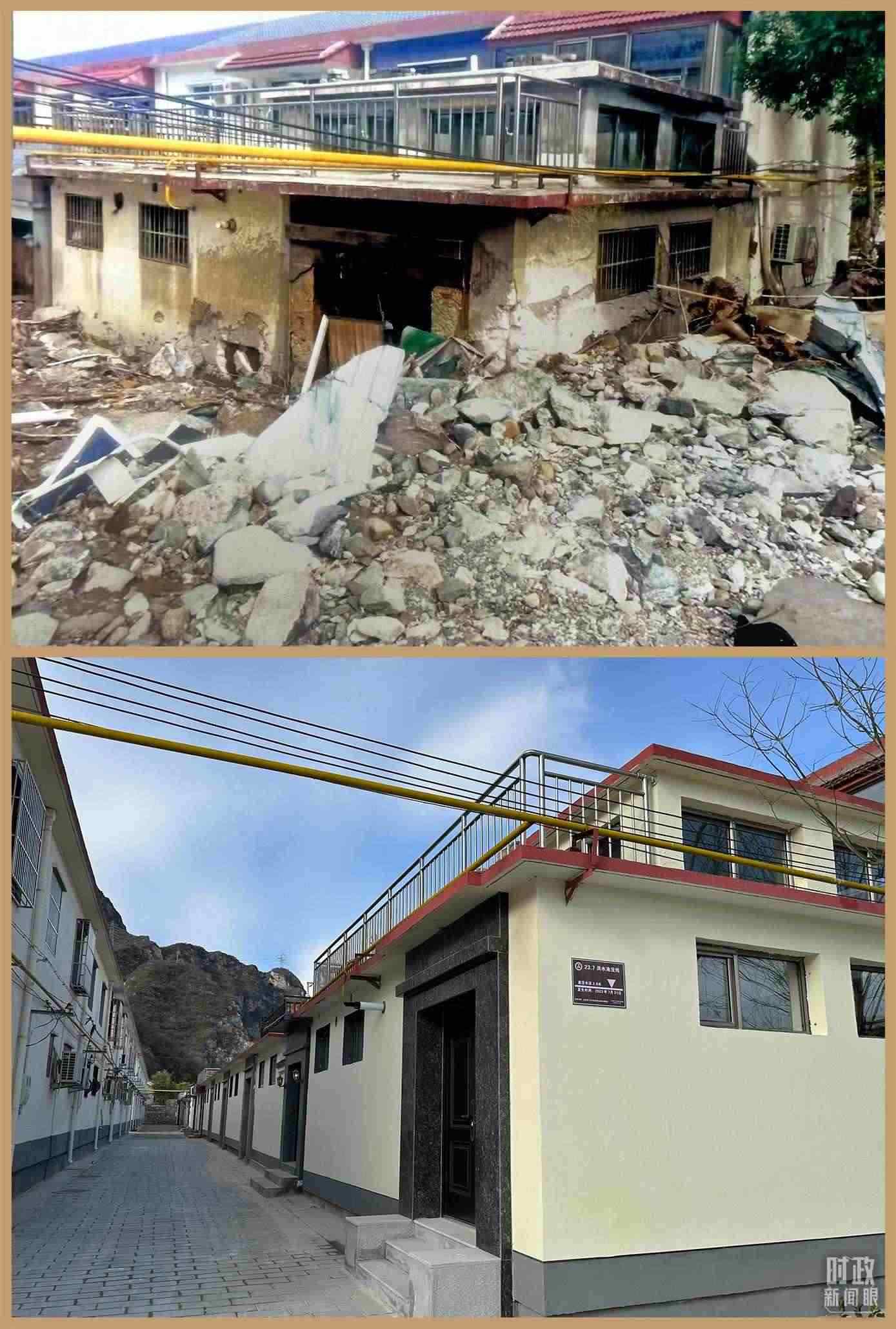 △ 村民房屋遭遇洪災(zāi)與災(zāi)后重建的對比圖。(總臺央視記者范一鳴拍攝)
