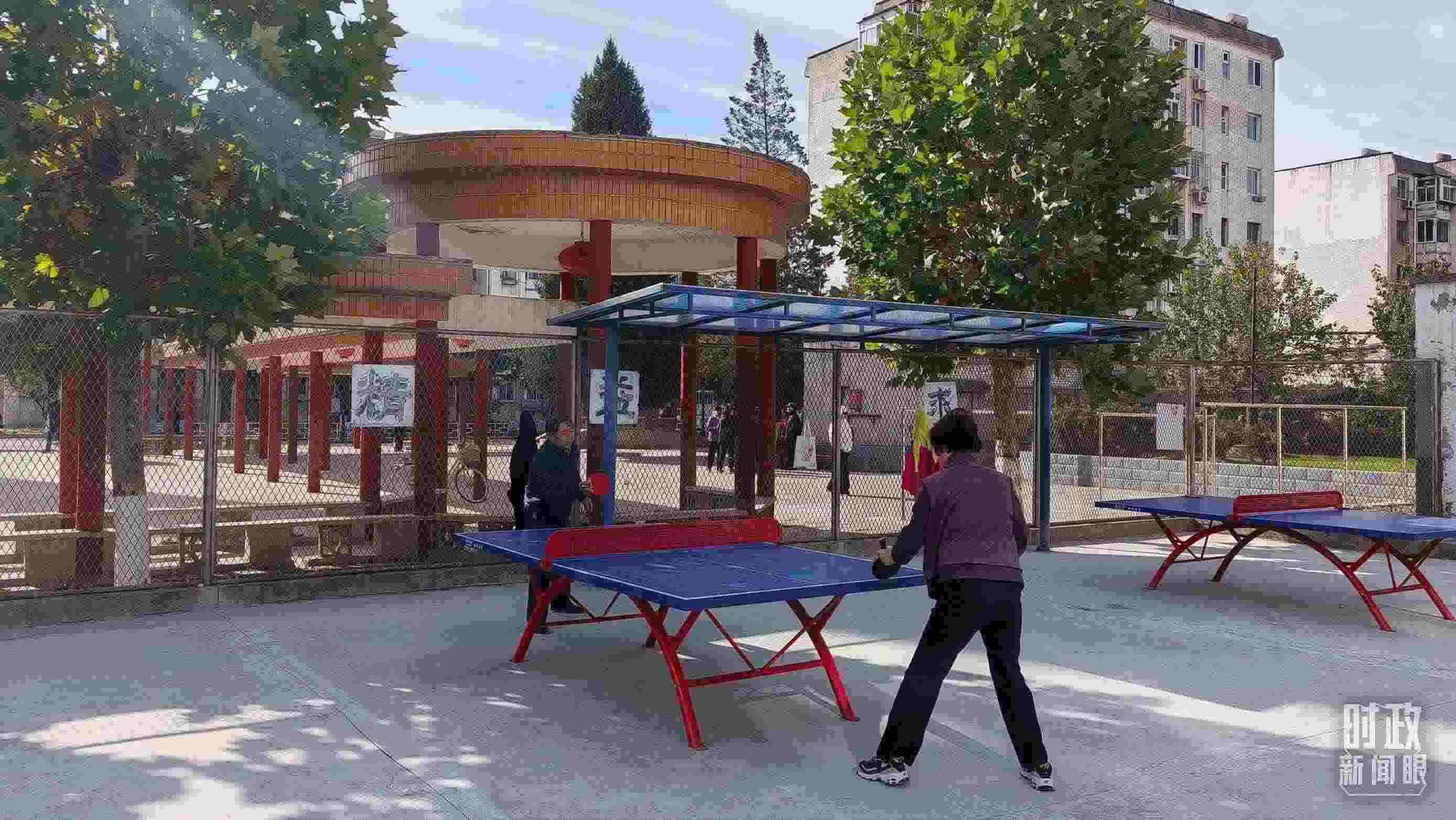 △ 涿州永濟(jì)秀園小區(qū)里的居民正在戶外打乒乓球。(總臺央視記者王萌萌拍攝)