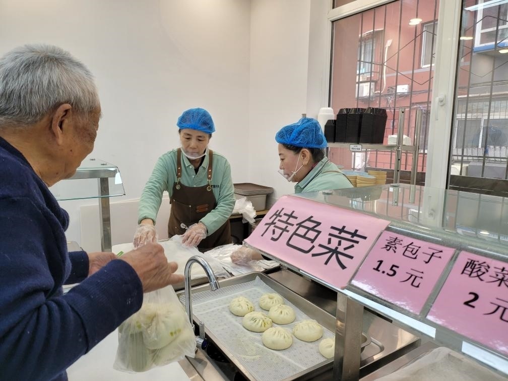 臨近中午,遼寧省沈陽市大東區(qū)東勝社區(qū)網(wǎng)格員在群中發(fā)布了“今日菜譜”:燒排骨、燒茄子、雪里紅燉豆腐……88歲的居民唐孝周來到社區(qū)開辦的惠民食堂,購買了一菜一飯,和鄰居邊聊邊吃。