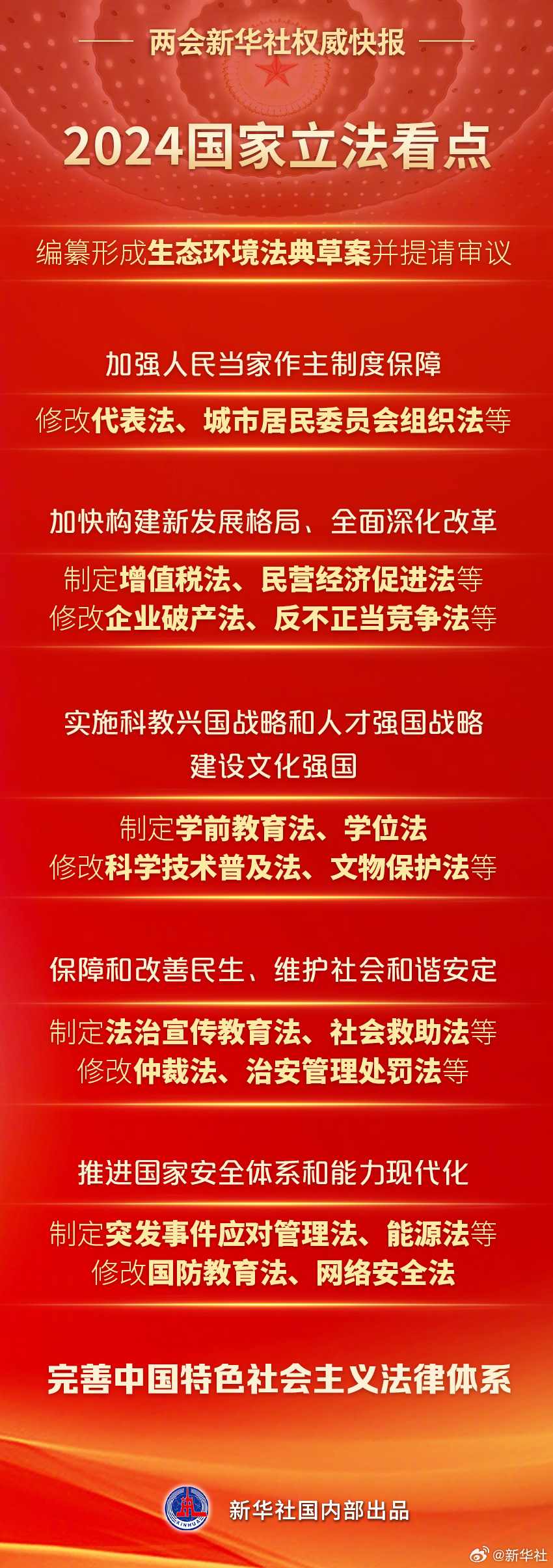 8日提請十四屆全國人大二次會議審議的全國人大常委會工作報告提出,2024年,要認真落實常委會立法規(guī)劃,完善中國特色社會主義法律體系:制定民營經濟促進法、學前教育法、社會救助法等,修改城市居民委員會組織法、文物保護法、網(wǎng)絡安全法等。