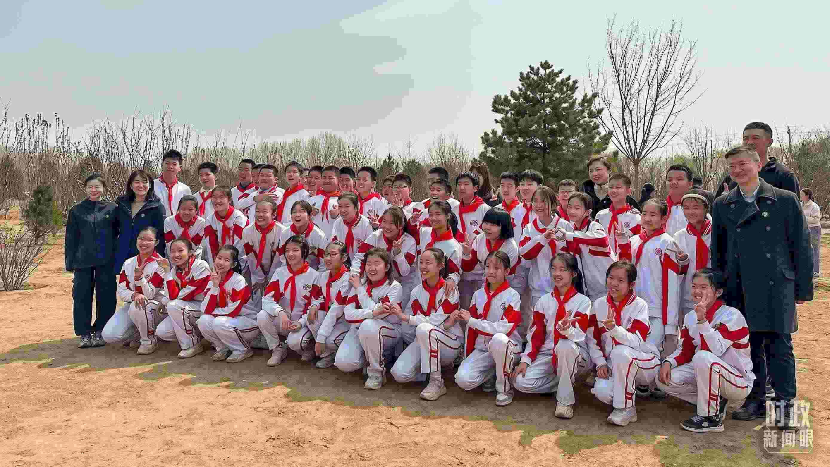 △參加植樹的少先隊員們合影留念。(總臺央視記者盧心雨拍攝)