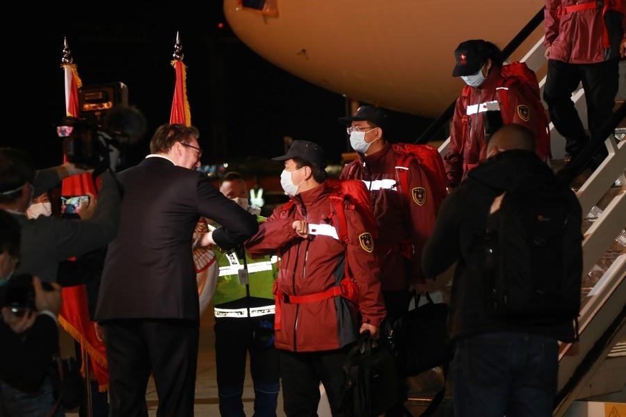 中國醫(yī)療團隊在貝爾格萊德尼古拉·特斯拉機場降落時已是深夜。武契奇率領塞方多名高級官員到機場迎接。疫情期間不建議握手,于是這位塞爾維亞領導人選擇和中國專家團成員一一碰肘以示尊重。對中國的及時支援心懷感激,他還在機場親吻了一面五星紅旗。