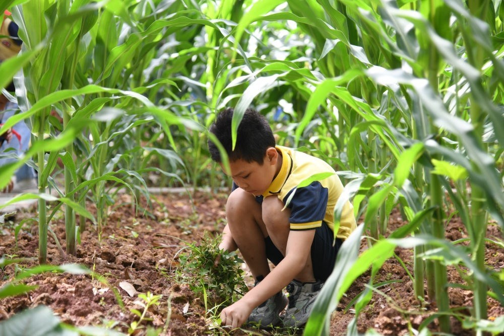 5月31日,學(xué)生在之江小學(xué)勞動(dòng)實(shí)踐基地除草。