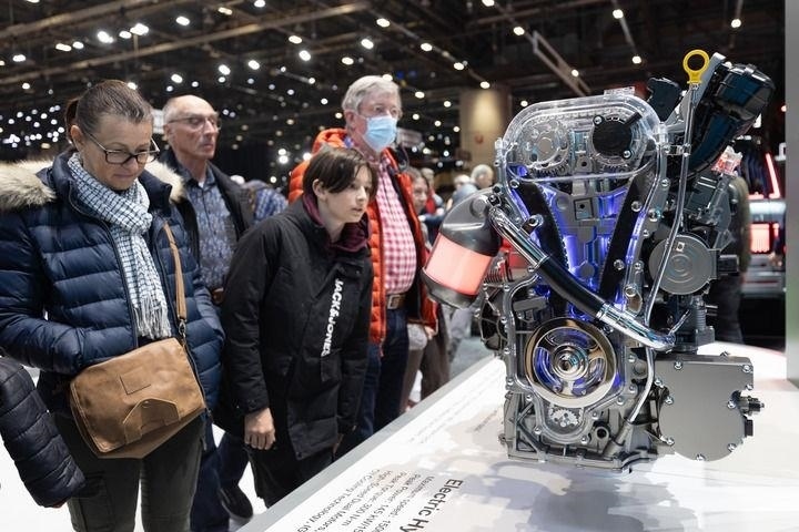 △觀眾在瑞士舉行的2024年日內(nèi)瓦國際車展上參觀比亞迪新款發(fā)動(dòng)機(jī)。