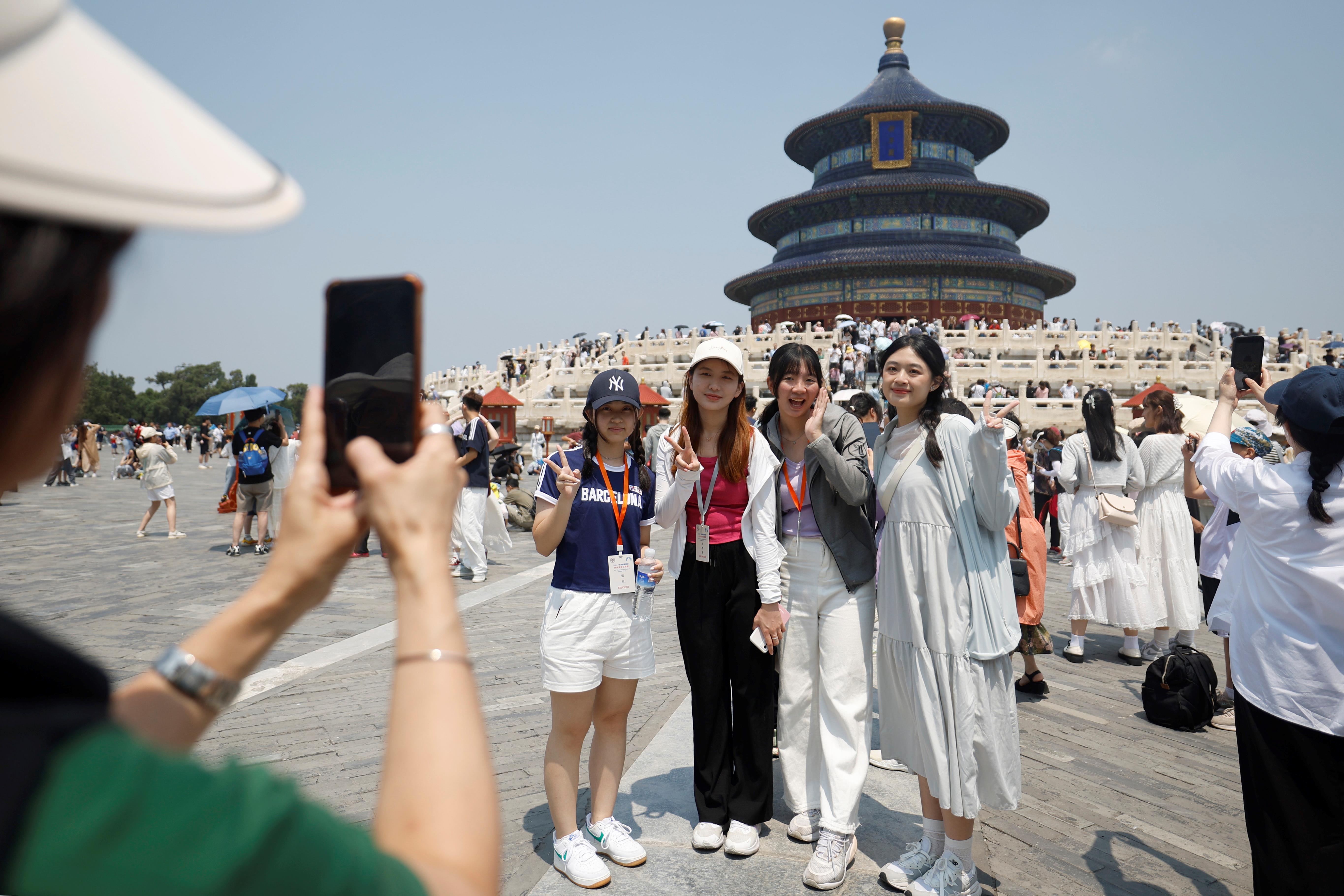 △2024年7月3日,臺灣青年在天壇公園拍照留念。當日,2024“未來能源領(lǐng)袖”兩岸青年交流營的營員參觀游覽北京的奧林匹克公園、天壇公園等地。
