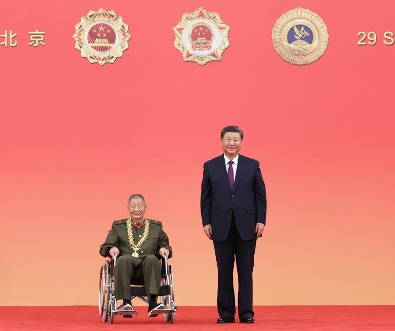 △2024年9月29日,國(guó)家勛章和國(guó)家榮譽(yù)稱號(hào)頒授儀式上,習(xí)近平總書(shū)記向“共和國(guó)勛章”獲得者黃宗德頒授勛章后合影。