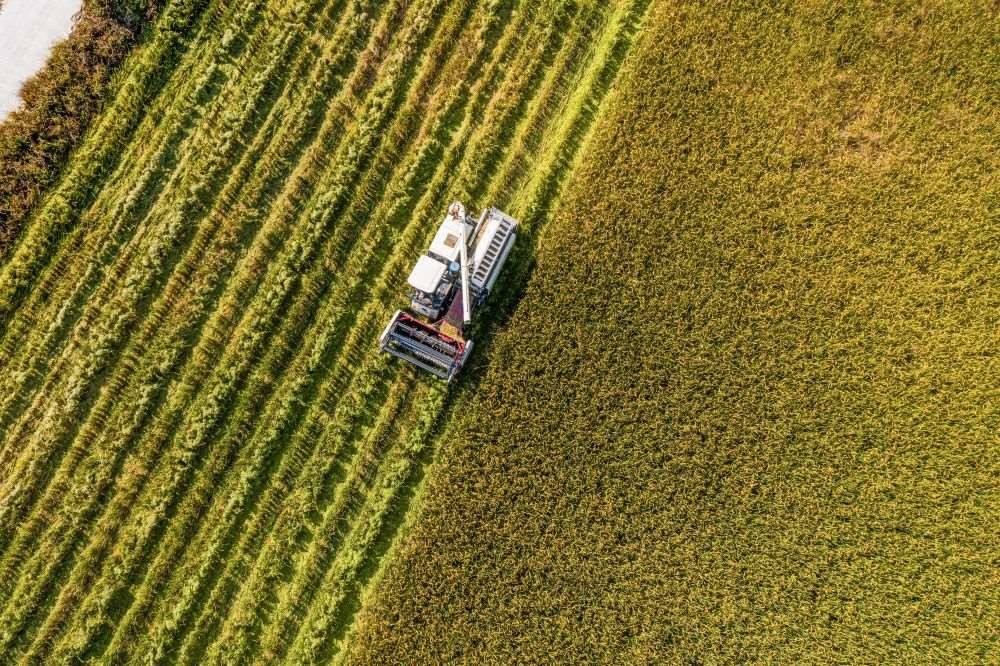 2024年10月25日,收割機(jī)在浙江省湖州市吳興區(qū)東林鎮(zhèn)保國(guó)村的稻田里作業(yè)(無(wú)人機(jī)照片)。新華社記者 徐昱 攝