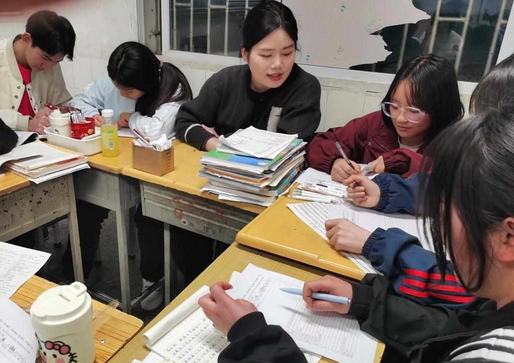 2024年4月21日,云南昭通大關一中教師劉雪瑤(左三)在輔導學生做作業(yè)。(李龍強 攝)