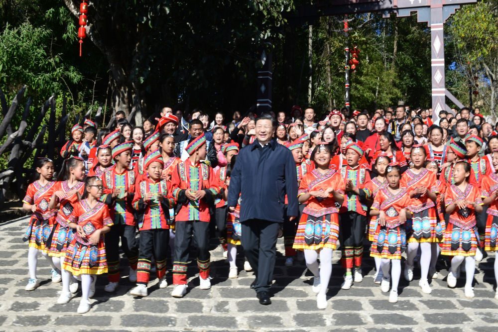 2020年1月19日下午,云南省騰沖市清水鄉(xiāng)三家村中寨司莫拉佤族村的鄉(xiāng)親們唱著《阿佤人民唱新歌》,簇擁著習近平走出村口。