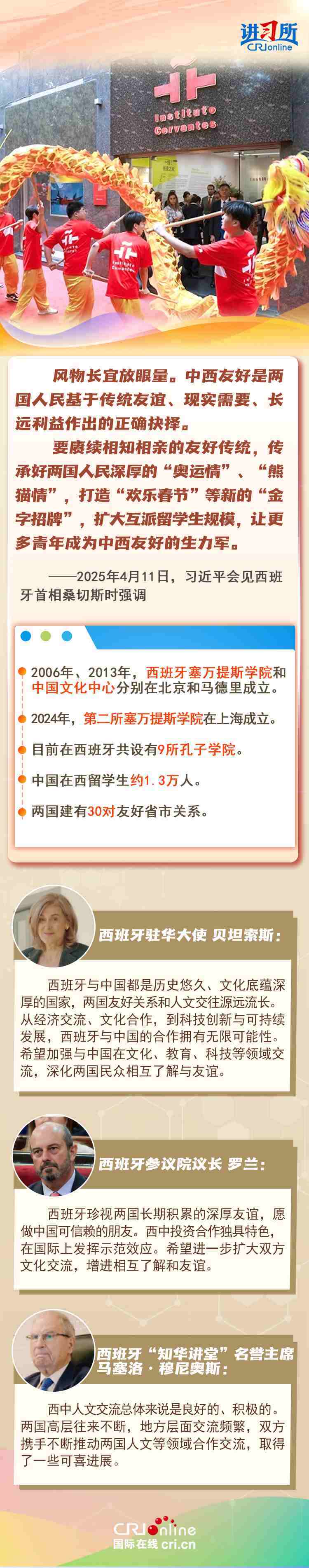 今年是中西全面戰(zhàn)略伙伴關(guān)系建立20周年,也是中歐建交50周年。多年來,中西兩國領(lǐng)導(dǎo)人保持密切互動(dòng),秉持互尊互信、互利共贏精神,兩國在深化貿(mào)易、投資、科技創(chuàng)新、綠色能源等領(lǐng)域取得豐富合作成果,雙邊關(guān)系走在中國同歐洲國家關(guān)系前列。在西班牙人士眼中,良好的對(duì)華關(guān)系對(duì)西班牙、歐洲和世界具有重要意義,將會(huì)為兩國人民帶來更多實(shí)實(shí)在在的福祉,也將共同創(chuàng)造更美好的未來。
