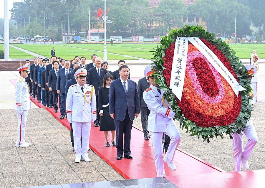2023年,習(xí)近平總書記在訪越期間來到巴亭廣場(chǎng),沿著載有無數(shù)歷史印記的石板路,前往胡志明陵敬獻(xiàn)花圈,追思緬懷。