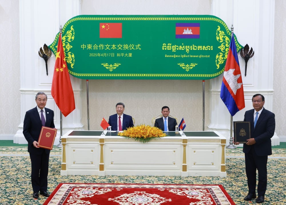 4月17日晚,國家主席習(xí)近平同柬埔寨首相洪瑪奈在金邊和平大廈舉行會談。這是會談后,兩國領(lǐng)導(dǎo)人共同見證中柬雙方交換雙邊合作文本。新華社記者 王曄 攝