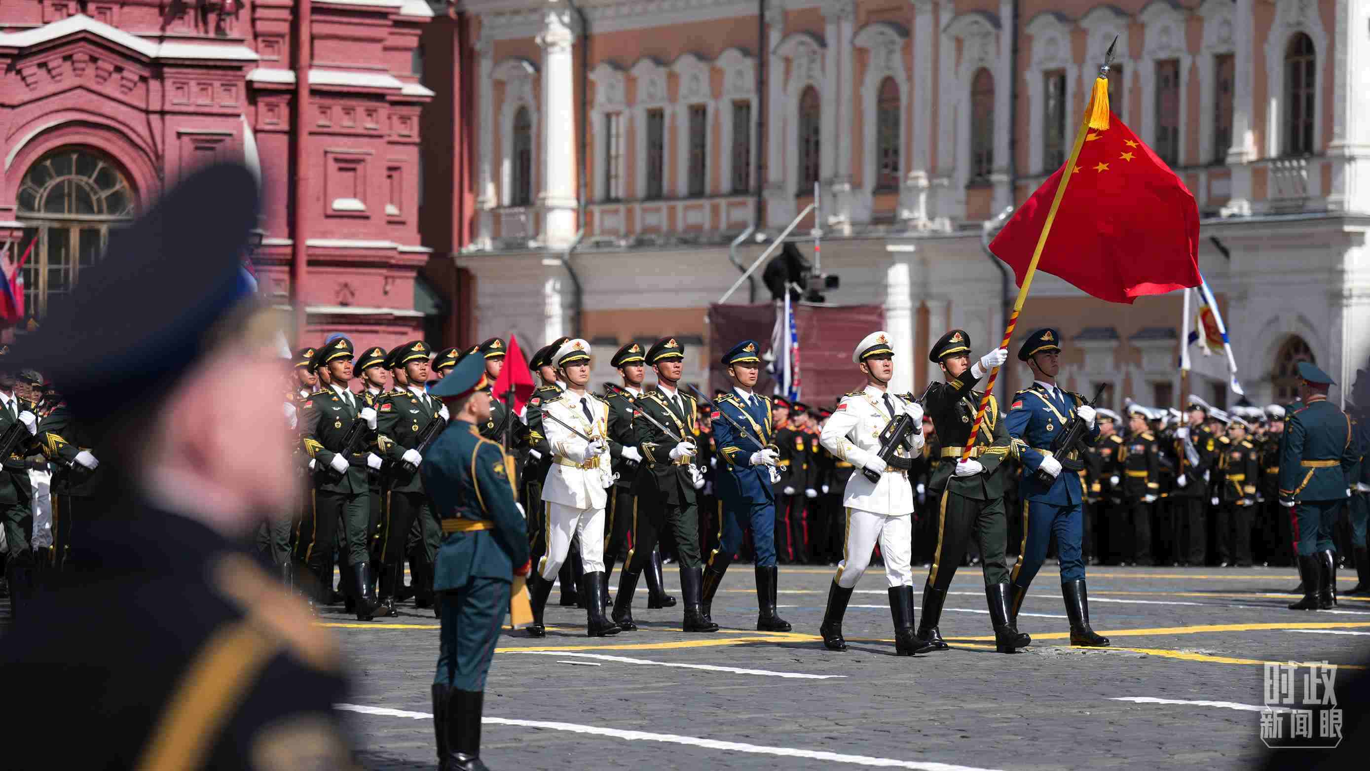 △中國人民解放軍三軍儀仗隊(duì)方隊(duì)軍容嚴(yán)整、士氣高昂,邁著堅(jiān)定有力的步伐走過紅場。(總臺(tái)記者李晉拍攝)