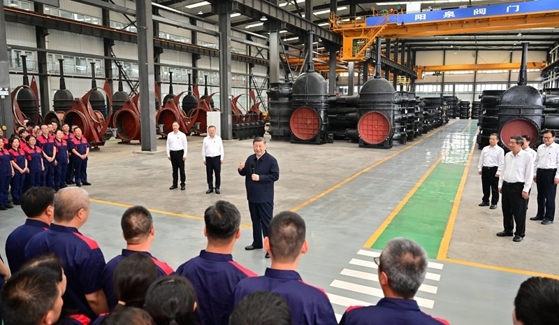 7月7日至8日,中共中央總書記、國家主席、中央軍委主席習(xí)近平在山西考察。這是7日下午,習(xí)近平在陽泉閥門股份有限公司考察時,同企業(yè)員工親切交流。新華社記者 燕雁 攝