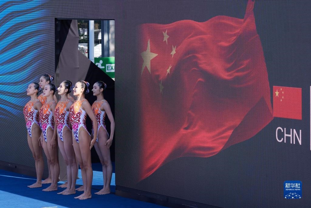 這是2022年6月24日,中國隊(duì)在游泳世錦賽花樣游泳集體自由自選決賽前入場。新華社記者 孟鼎博 攝