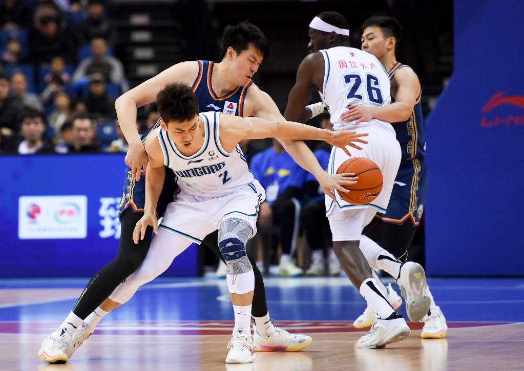 3月13日,青島隊(duì)球員王睿澤(左前)與南京同曦隊(duì)球員董瀚麟(左后)拼搶。新華社記者李紫恒攝