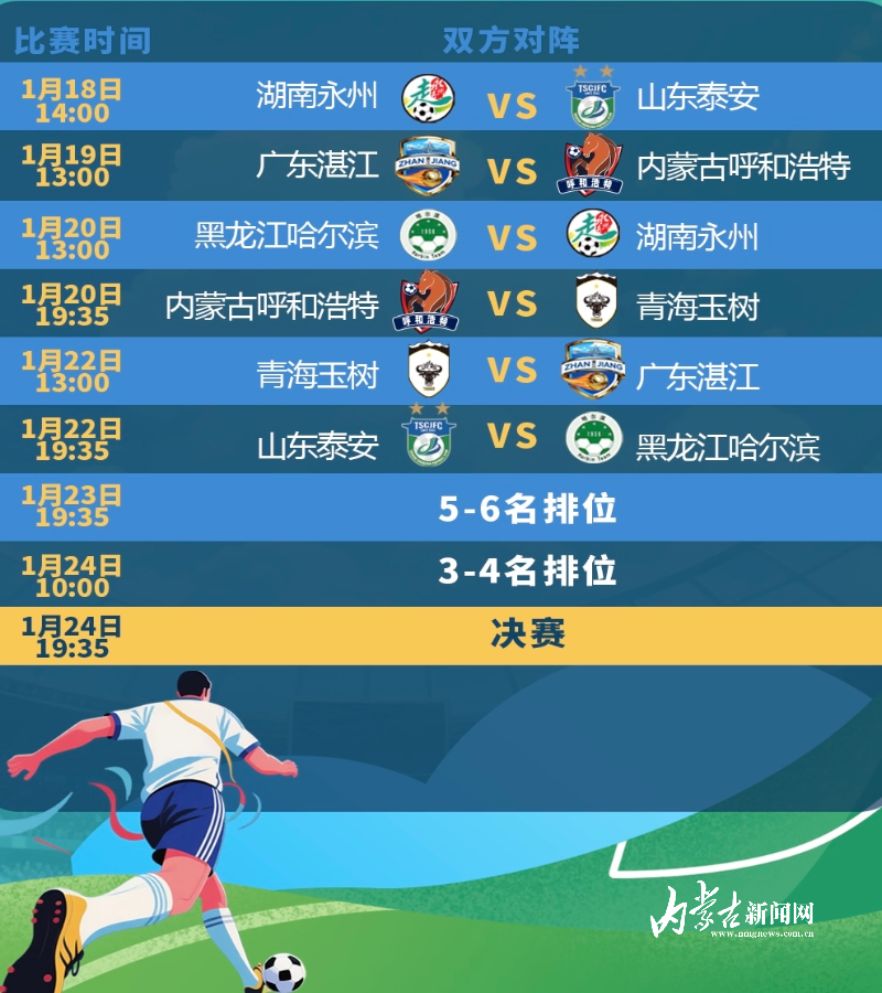 群眾足球風(fēng)云再起,一場匯聚南北、融合競技與文化的群眾足球盛宴即將激情上演。1月18日至1月24日,CMG群眾足球邀請賽將在湖南省永州市拉開帷幕。1月11日晚,抽簽結(jié)果正式揭曉,呼和浩特隊將于1月19日首戰(zhàn)粵超冠軍廣東湛江隊。球隊將于1月16日啟程,在永州進(jìn)行合練。
