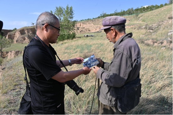 鏡頭見證滄桑,筆尖記錄百姓。這些年,只要疫情緩解,長(zhǎng)城人沒(méi)有停下腳步,而是一次又一次去看長(zhǎng)城、看邊堡、看邊墻下的鄉(xiāng)親們。車靜靜地行駛在空曠、蒼涼的長(zhǎng)城腳下,76歲的牧羊人呂三良正在長(zhǎng)城邊牧羊。2022年5月24日,呼和浩特市長(zhǎng)城科普學(xué)會(huì)會(huì)員追隨牧羊人的腳步,把照片送到呂三良手中,看著老人端詳著照片里的自己,會(huì)員們特別滿足。這,難道就不是一個(gè)攝影人的長(zhǎng)城情懷、百姓情懷嗎?(郭雁平 高曉梅)