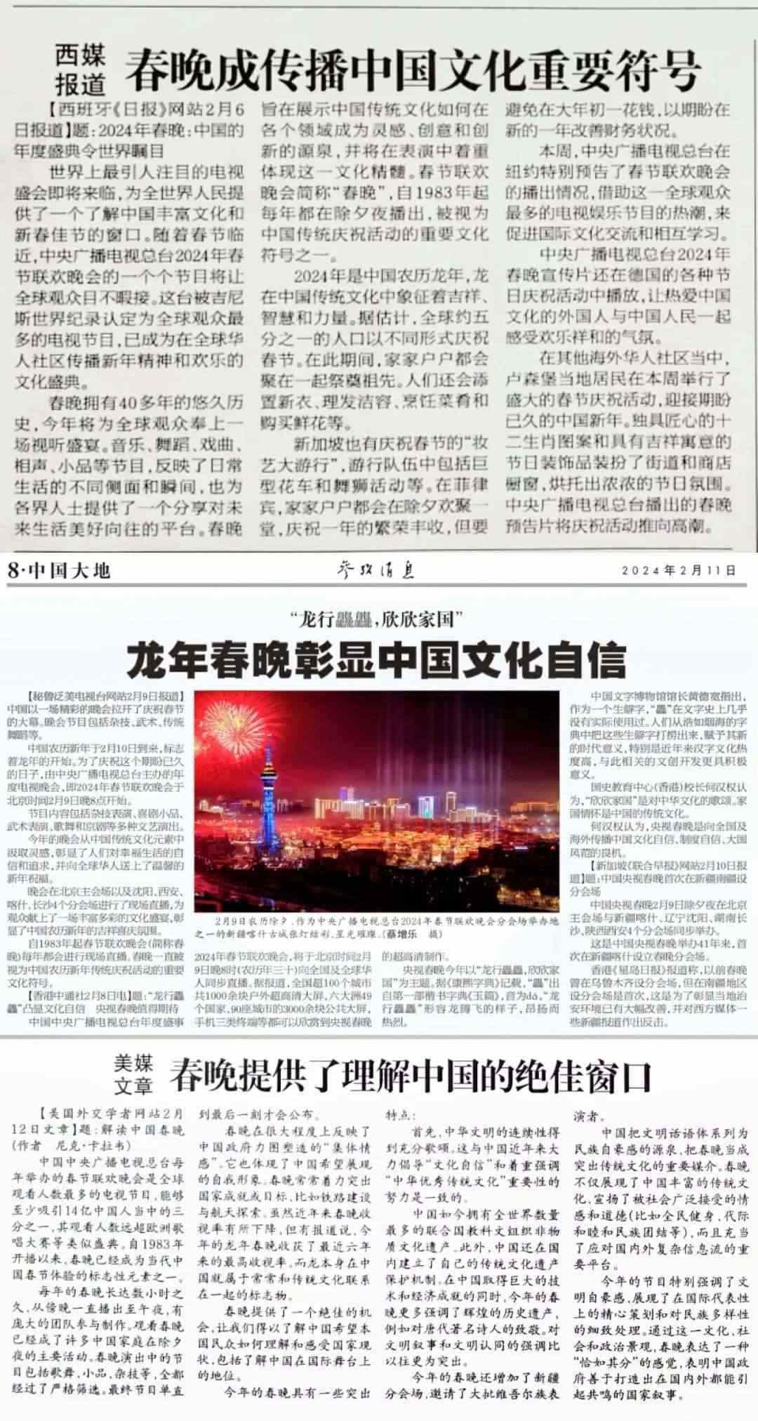 《參考消息》援引西班牙媒體評(píng)論稱,總臺(tái)龍年春晚為全世界人民提供了一個(gè)了解中國(guó)豐富文化的窗口,它展示中國(guó)傳統(tǒng)文化如何在各個(gè)領(lǐng)域成為靈感、創(chuàng)意和創(chuàng)新的源泉,并在音樂、舞蹈、戲曲等節(jié)目中體現(xiàn)傳統(tǒng)文化的精髓。秘魯、新加坡等媒體報(bào)道稱,龍年春晚彰顯了中國(guó)的文化自信。而美國(guó)《外交學(xué)者》網(wǎng)站署名文章認(rèn)為,龍年春晚為世界提供了理解中國(guó)的絕佳窗口。海外媒體的這些報(bào)道,不約而同地使用了“文化符號(hào)”“標(biāo)志性元素”等詞匯,并從促進(jìn)文化理解、推動(dòng)文化交流等角度對(duì)總臺(tái)春晚的海外影響力進(jìn)行解讀。