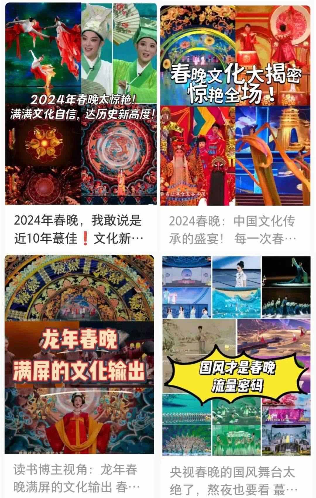 春晚的文化展現(xiàn),在國(guó)人中也引起了熱烈反響?!懊恳粋€(gè)文化類節(jié)目都蘊(yùn)含著獨(dú)特的中國(guó)之美,這種美有的跨越千年,有的多經(jīng)磨難,春晚給我們呈現(xiàn)了一場(chǎng)場(chǎng)宏大的視聽盛宴,作為觀眾很難不動(dòng)容”“從今年春晚真真切切地感受到了文化自信,大好河山,傳統(tǒng)文化,國(guó)家強(qiáng)盛,美美與共”“文化傳統(tǒng)特色給各個(gè)節(jié)目都刷了創(chuàng)意的漆,霸氣從節(jié)目中升騰,自信從感嘆中生發(fā),真妙”......