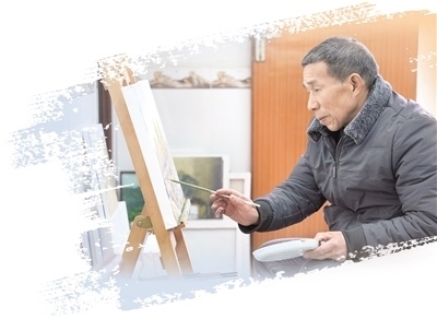 一手托著調(diào)色盤,一手舉著畫筆,眼前一個(gè)畫架,陳云發(fā)常常沉浸在自己的創(chuàng)作中。過去,陳云發(fā)以種田和做泥瓦工為生。藝術(shù)區(qū)建設(shè)期間,陳云發(fā)家中的幾間房子被張佰橋租來存放畫具。藝術(shù)家們創(chuàng)作時(shí),陳云發(fā)也在旁邊看。后來,張佰橋送給陳云發(fā)一套畫具,“感興趣,就跟著學(xué)!”