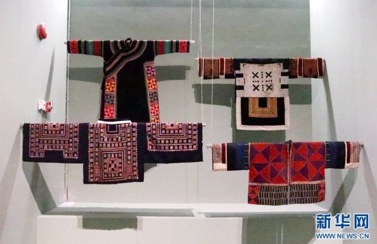《傳統(tǒng)@現(xiàn)代——民族服飾之舊裳新尚》展出的部分服飾(攝于5月18日)。新華網(wǎng)念新洪攝