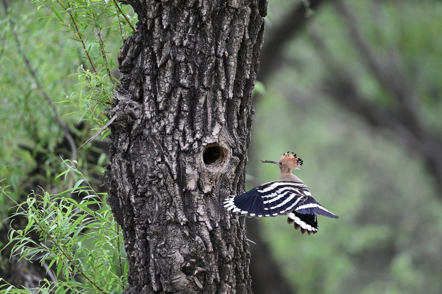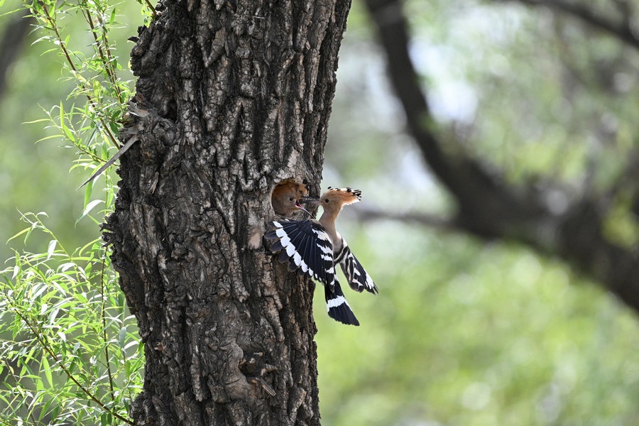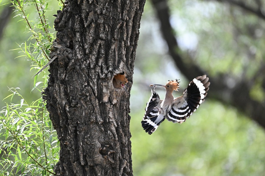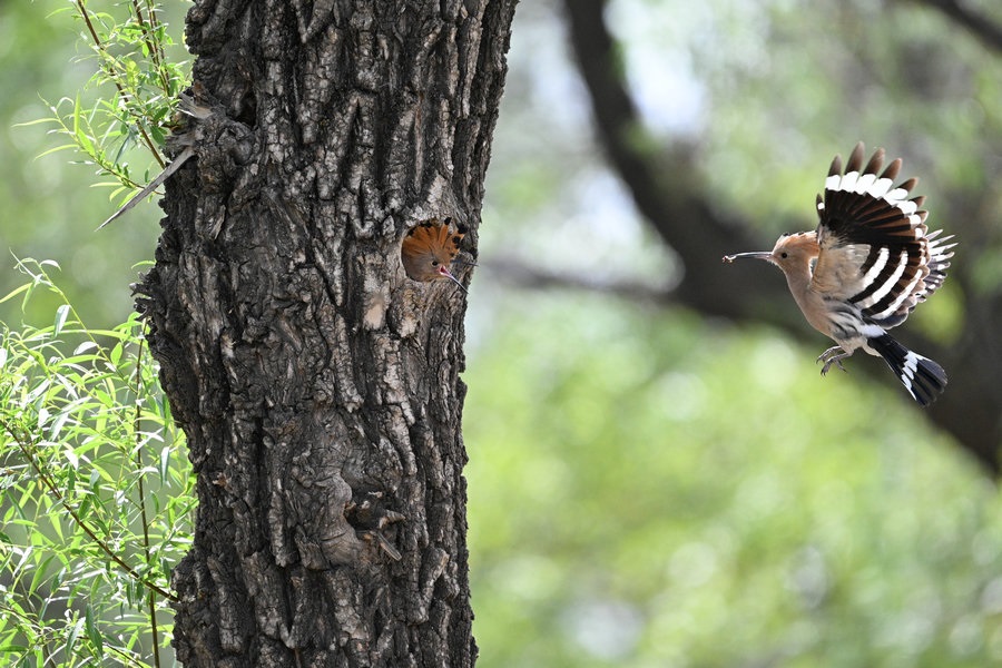 6月4日,呼和浩特市玉泉區(qū)大黑河沿岸,戴勝鳥在樹林、草叢中覓食,捉到蟲子飛回窩喂給鳥寶寶,3個(gè)小時(shí)內(nèi)往返數(shù)十次。吸引了眾多攝影愛好者前來(lái)拍攝。