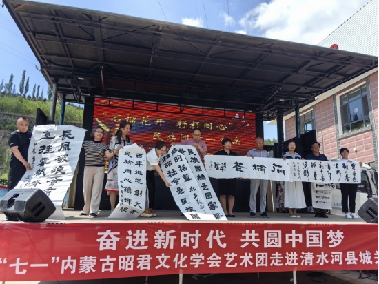 據(jù)了解,本次進社區(qū)活動由內(nèi)蒙古昭君文化學(xué)會、清水河縣城關(guān)鎮(zhèn)政府、昆新社區(qū)主辦,活動以“鑄牢中華民族共同體意識,構(gòu)筑中華民族共有精神家園”和慶祝中國共產(chǎn)黨建黨103周年為主旨,以書法、歌舞等群眾喜聞樂見的藝術(shù)形式,歌頌中國共產(chǎn)黨帶領(lǐng)全國各族人民守望相助、團結(jié)奮斗砥礪前行的光輝歷程以及取得的偉大成就,真情詮釋不忘初心,牢記使命的責(zé)任擔(dān)當(dāng)。