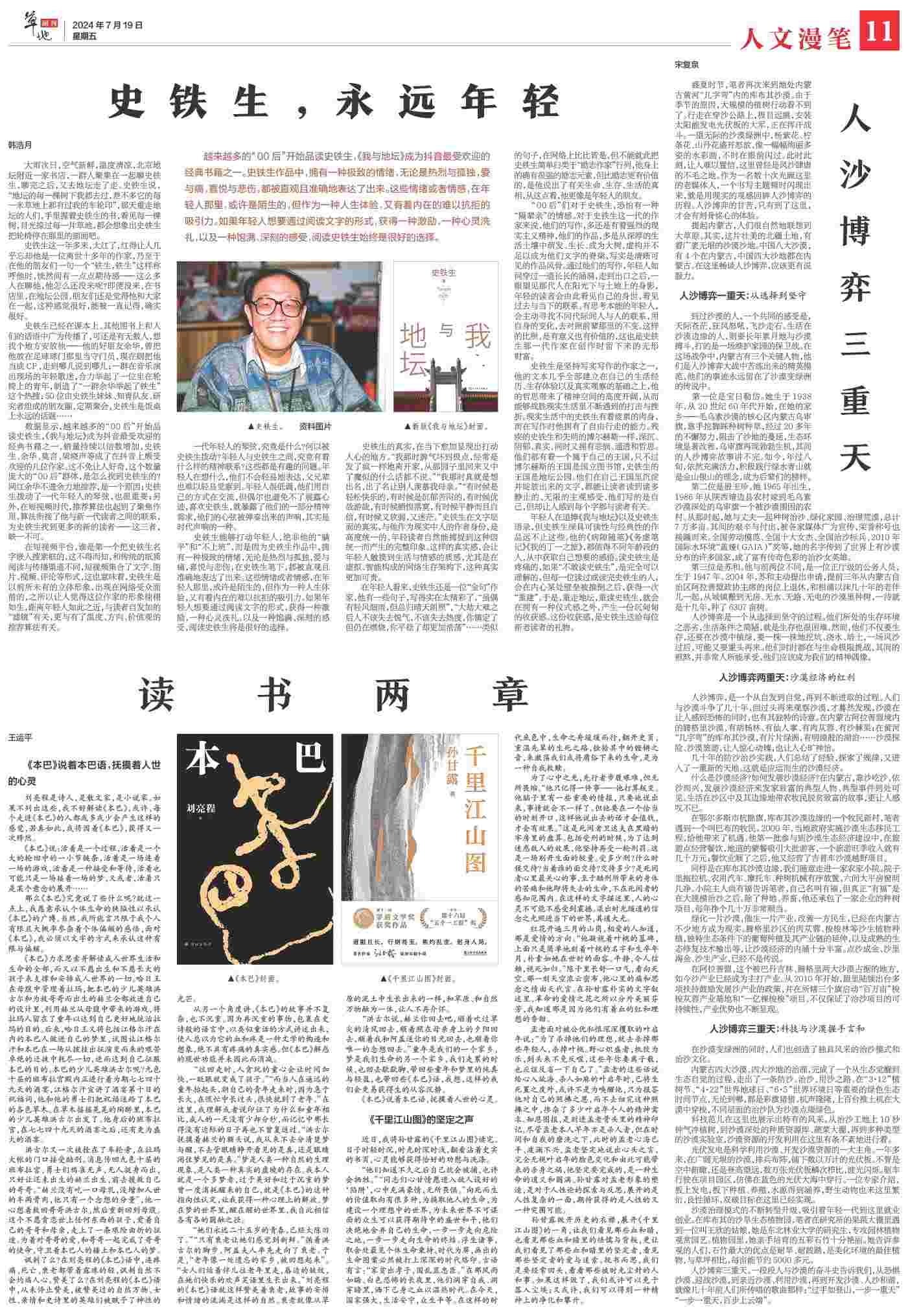 到過沙漠的人,一個共同的感受是,天際蒼茫,狂風(fēng)怒吼,飛沙走石。生活在沙漠邊緣的人,則要長年累月地與沙漠搏斗,打的是一場維護家園的保衛(wèi)戰(zhàn)。在這場戰(zhàn)爭中,內(nèi)蒙古有三個關(guān)鍵人物,他們是人沙博弈大戰(zhàn)中苦練出來的精英模范,他們的事跡永遠留在了沙漠變綠洲的傳說中。