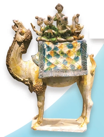 陜西歷史博物館藏三彩載樂駱駝俑,見證了文化藝術(shù)交融的歷史。一塊色彩斑斕的毛毯置于駝背之上,7名樂手手持不同樂器盤腿演奏,中間一女子正動情歌唱。一個“駝背上的樂隊”,再現(xiàn)了鮮活的盛唐長安,各地人們在此相遇,盡情演繹對美好生活的追求。