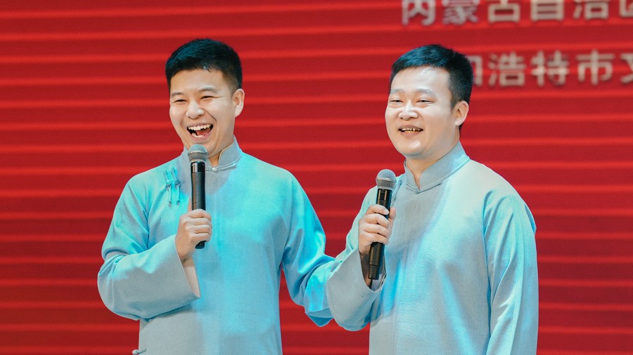 演出在舞步奔放、節(jié)奏明快的群舞《輝煌》中拉開帷幕,文藝志愿者們各展才藝,節(jié)目形式多樣,涵蓋了歌舞、小品、雜技、二人臺、呼麥等多種藝術形式。相聲《開心一刻》幽默詼諧,演員妙語連珠,引得觀眾笑聲不斷;小品《一路風情走青城》聚焦日常點滴,用接地氣的故事展現(xiàn)呼市新風貌,讓人倍感親切;歌曲《請到草原來》《歌在飛》《歌游內蒙古》,文藝志愿者們用嘹亮歌聲傳遞對家鄉(xiāng)、對祖國的熱愛;二人臺對唱《掛起紅燈拜新年》、呼麥《馬群贊》飽含深情;藝體表演《武動乾坤》、雜技《鍋碗瓢盆交響曲》創(chuàng)意十足,現(xiàn)場驚嘆聲此起彼伏;獨舞《雄鷹》以剛勁的肢體語言,詮釋鷹擊長空磅礴氣勢;《舞蹈美草》用輕盈的舞步展現(xiàn)原野的律動;最后,全體演員與觀眾齊聲合唱《我的祖國》,將演出推向最高潮。精彩的表演贏得了現(xiàn)場400多名觀眾的陣陣掌聲和歡呼聲,氣氛熱烈非凡。