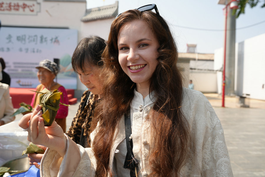 活動現(xiàn)場,粽香四溢,歡聲笑語此起彼伏。大家圍在一起,捋粽葉、填糯米、扎絲線,共同體驗包粽子的傳統(tǒng)習俗。手法嫻熟的村民手把手教授外國友人包粽子的技巧,不一會兒,一個個形態(tài)各異的粽子便擺滿了桌。來自烏克蘭的留學生安吉麗娜學得格外認真,她一邊模仿著村民的動作,一邊忍不住贊嘆:“喜歡包粽子,粽子好吃!”言語間滿是對中國傳統(tǒng)美食的喜愛。