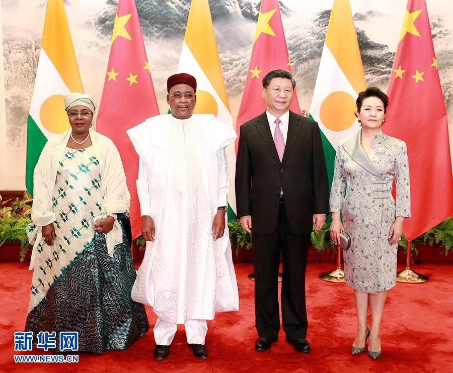 5月28日,國家主席習近平在北京人民大會堂同尼日爾總統(tǒng)伊素福舉行會談。這是習近平和夫人彭麗媛同伊素福夫婦合影。